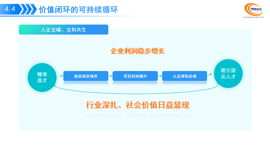 项目经理选培体系并非单一层面的体系建设和应用,而是贯穿企业行业乃至社会价值链的核心体系,需从 “方法工具、体系构建、价值兑现、人企互哺” 四个维度协同发力,通过科学选拔机制、训战结合培养体系、组织赋能机制、价值兑现体系进行项目经理选培体系的构建和实践探索。在演讲中,赵增龙通过方正国际选培体系建设的实例以及阶段性成果分析分享,进一步阐释了方正国际选培体系以 “精准选才”筑根基,“靶向育才”强筋骨,实现人才价值向商业成果的链式转化,最终达成“人企互哺,互利共生”的持续可循环价值闭环,项目管理跃升为价值管理。